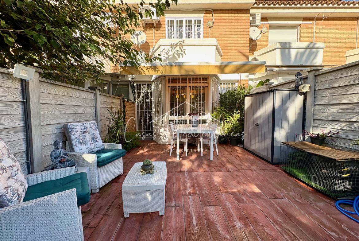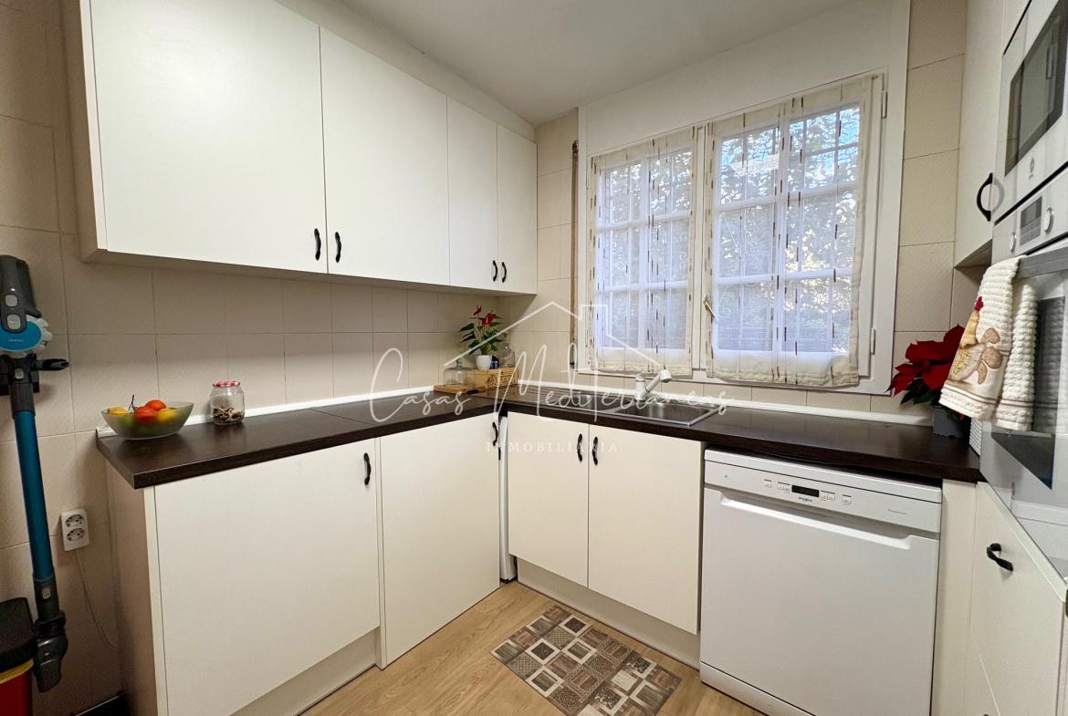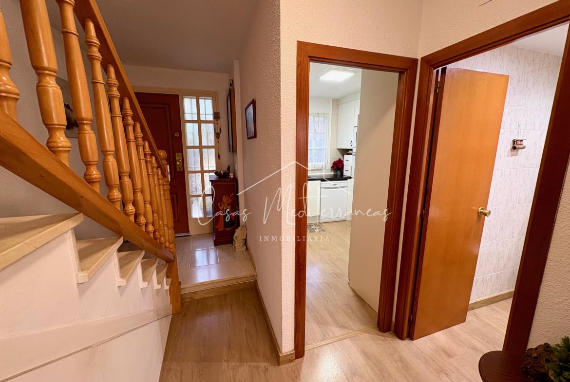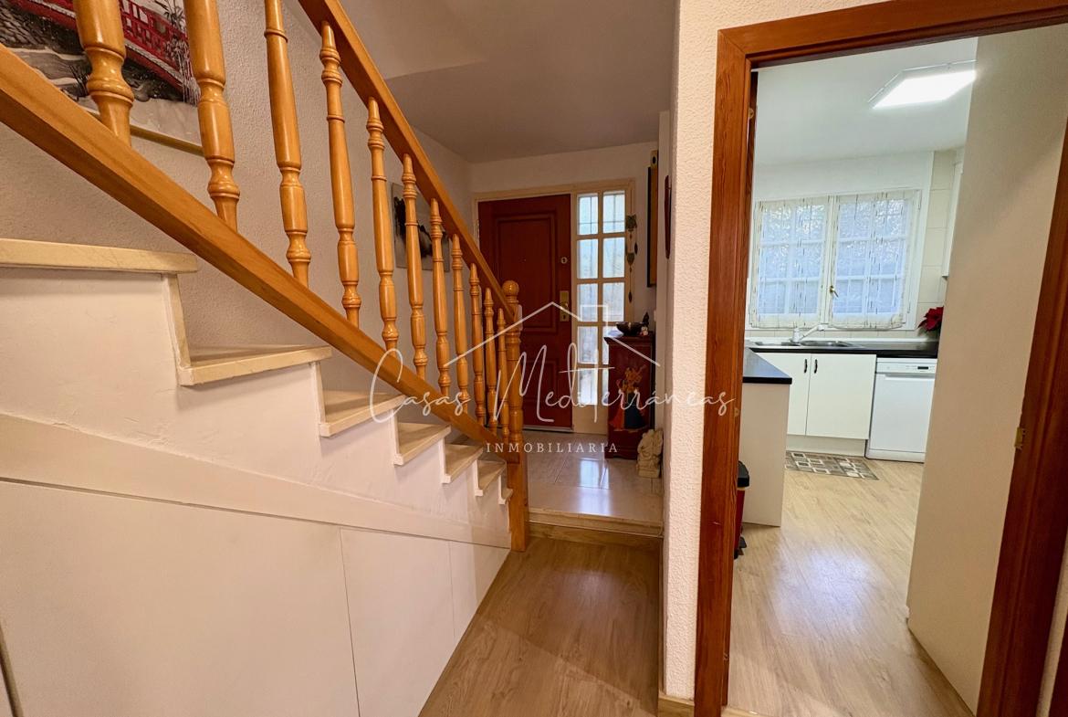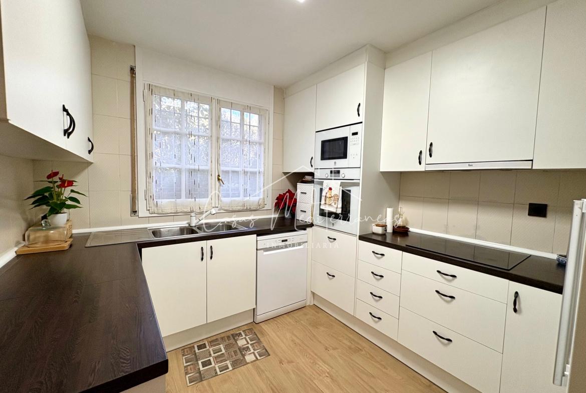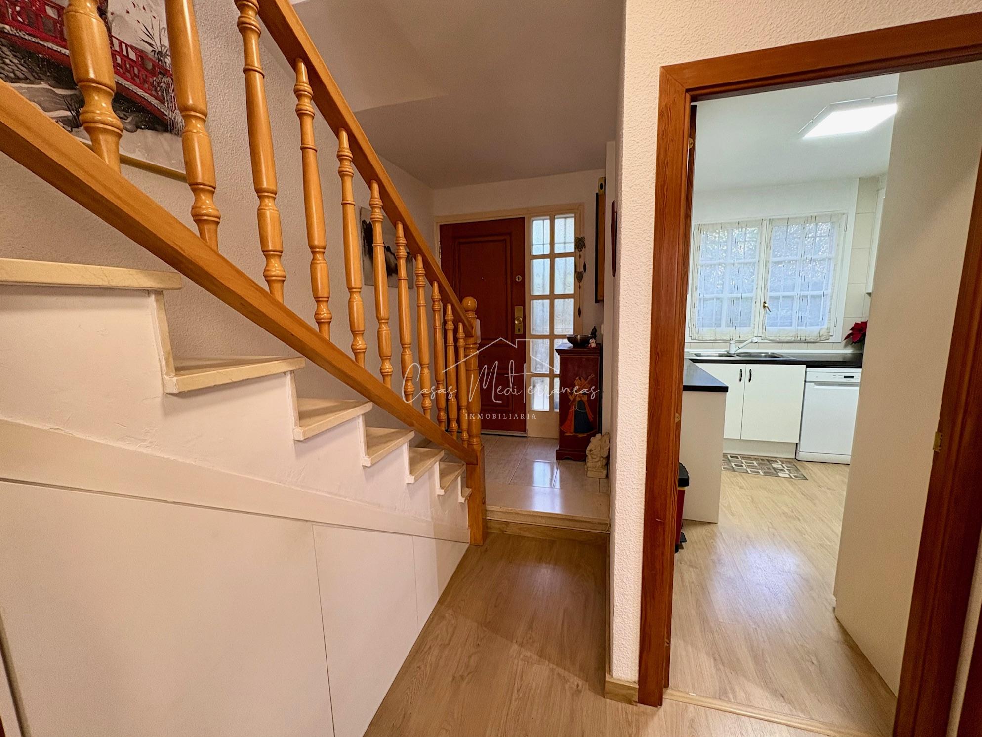 En planta baja encontramos un amplio salón comedor con salida a una gran e intima terraza con barbacoa, que da acceso a zona comunitaria, cocina independiente totalmente equipada, aseo. Todas las estancias muy luminosas. En la planta superior encontramos tres dormitorios con armarios empotrados y un baño completo con bañera. Desde el dormitorio principal, tenemos acceso a una terraza privada. La vivienda dispone de aire acondicionado y calefacción en el salón y habitaciones. Dispone de plaza de parking subterráneo con acceso mediante rampa, con la posibilidad de alquilar una segunda.